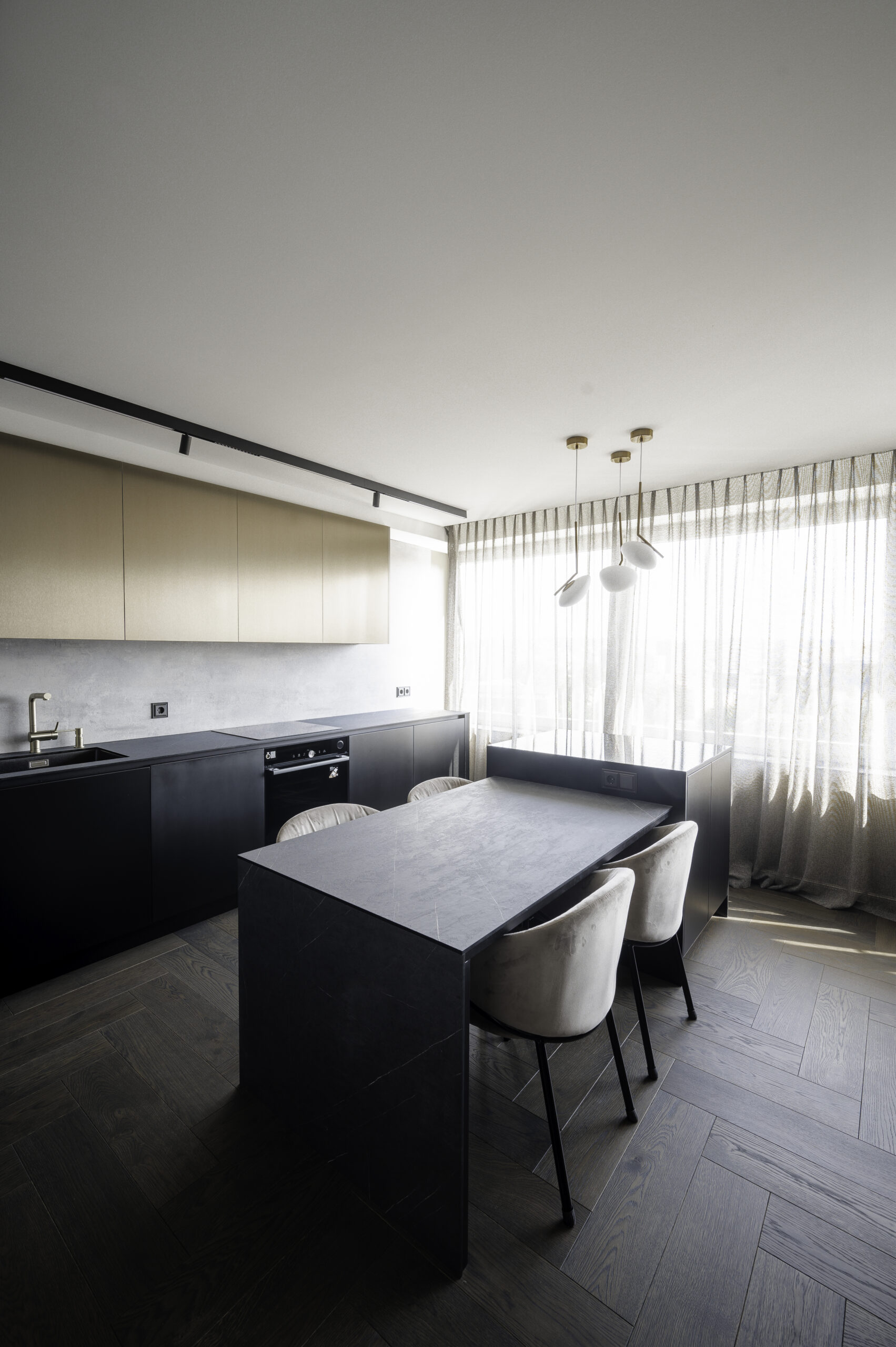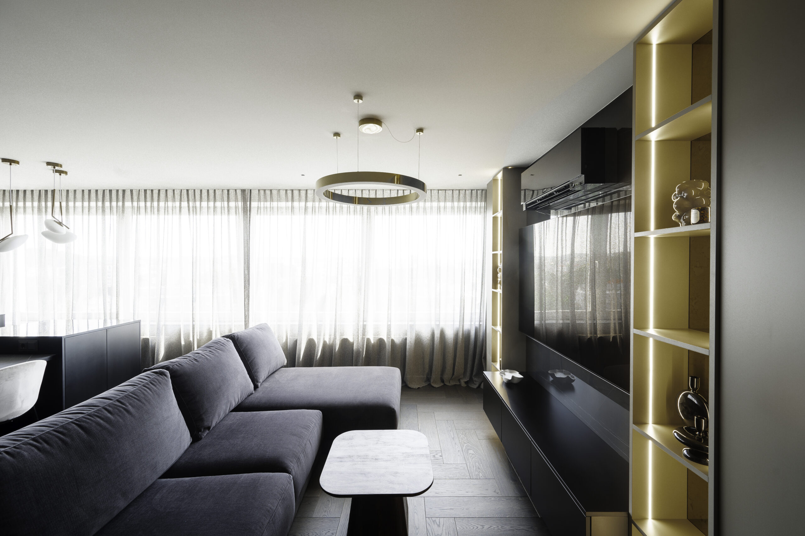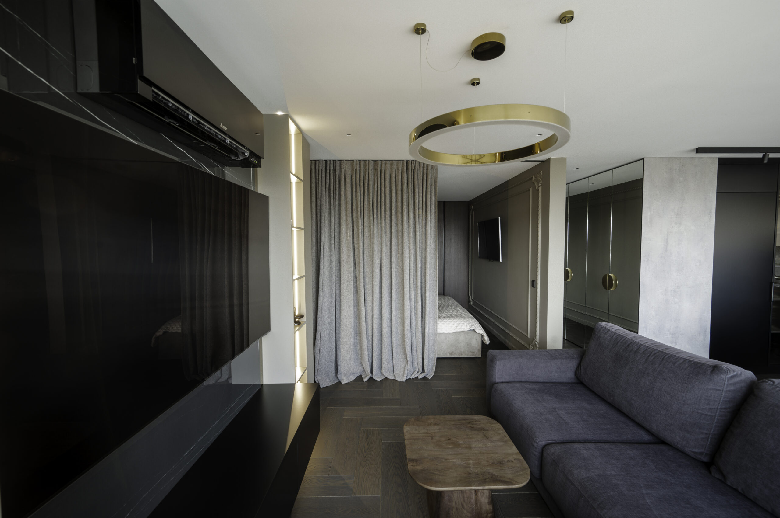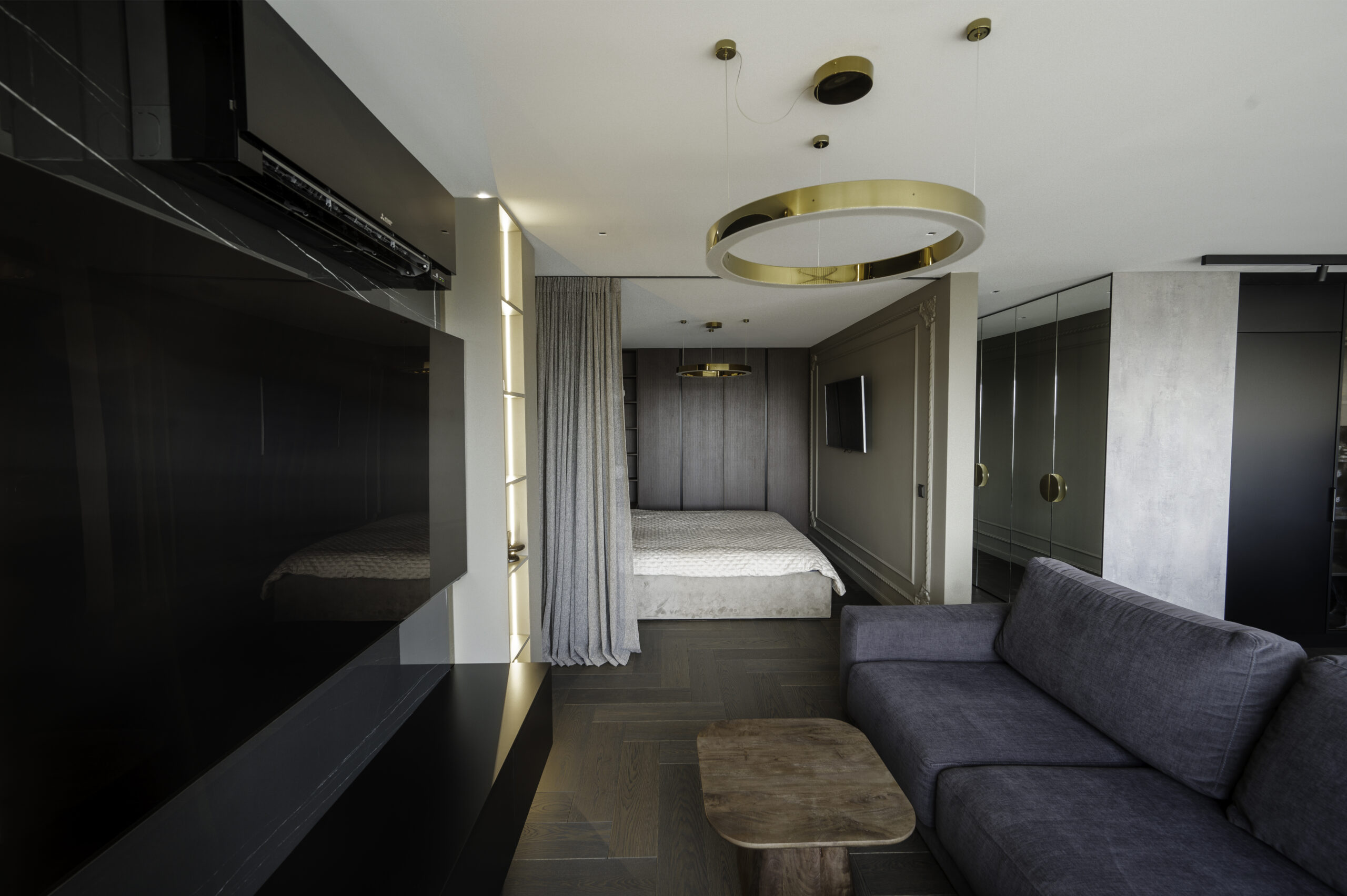 Tai drąsus, modernus ir išraiškingas butas su nuostabia panorama į Vilnių. Kaip ir kiekvienas interjeras, tai ir šis yra Užsakovo atspindys. Užsakovas yra jaunas, nebijantis iššūkių vyras, todėl bute persipynė klasikos ir modernumo elementai. Nebijojome tamsių tonų, aukso akcentų ir sunkių drobinių užuolaidų, kurios atskyrė miegamąjį nuo svetainės, nes tai studijos tipo butas.