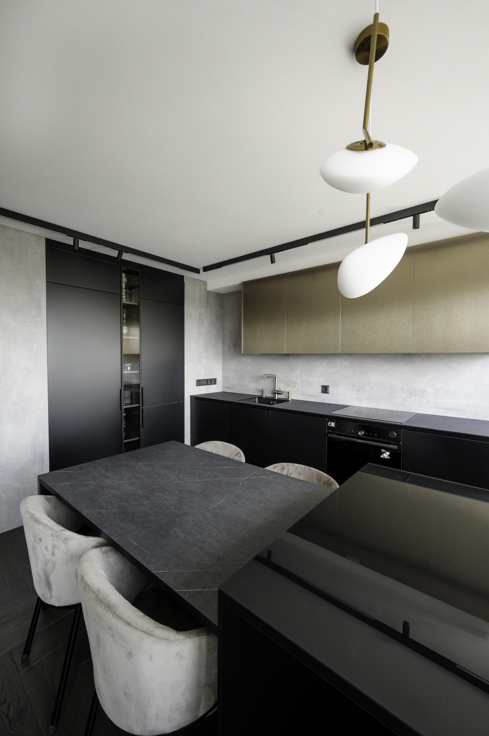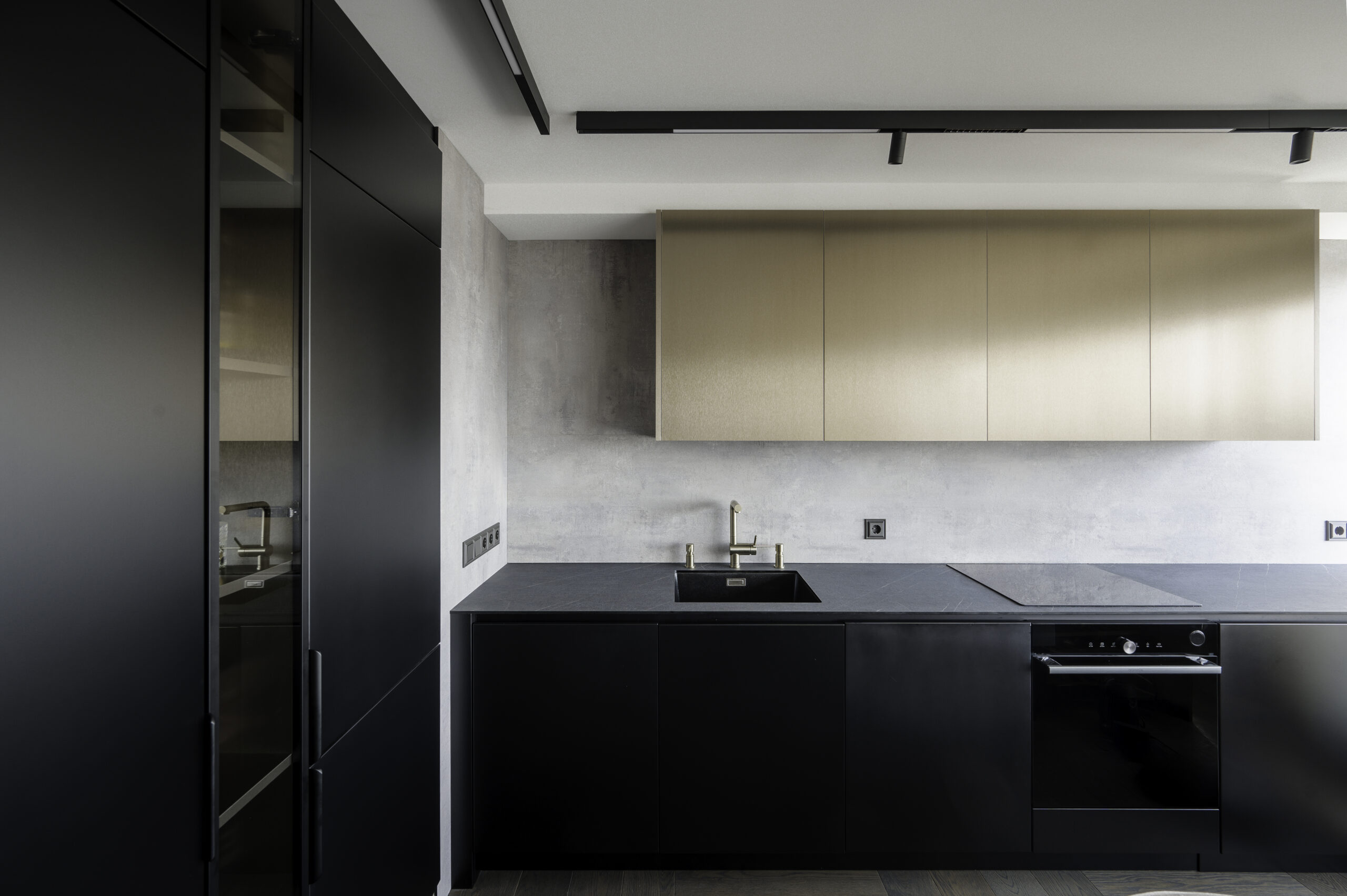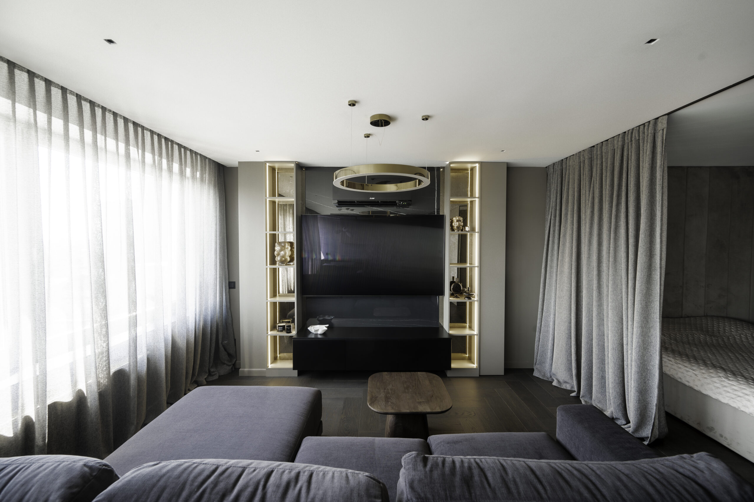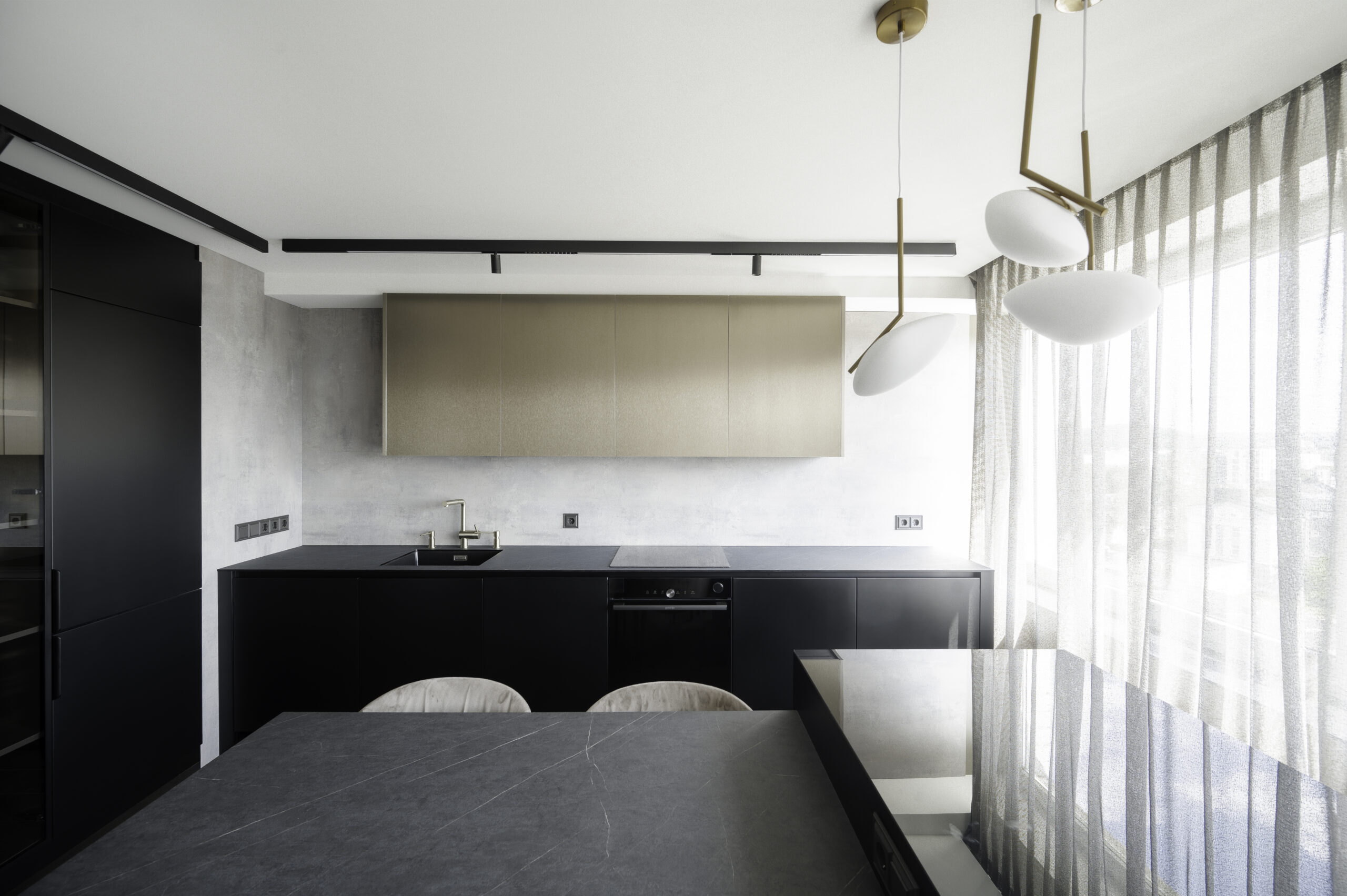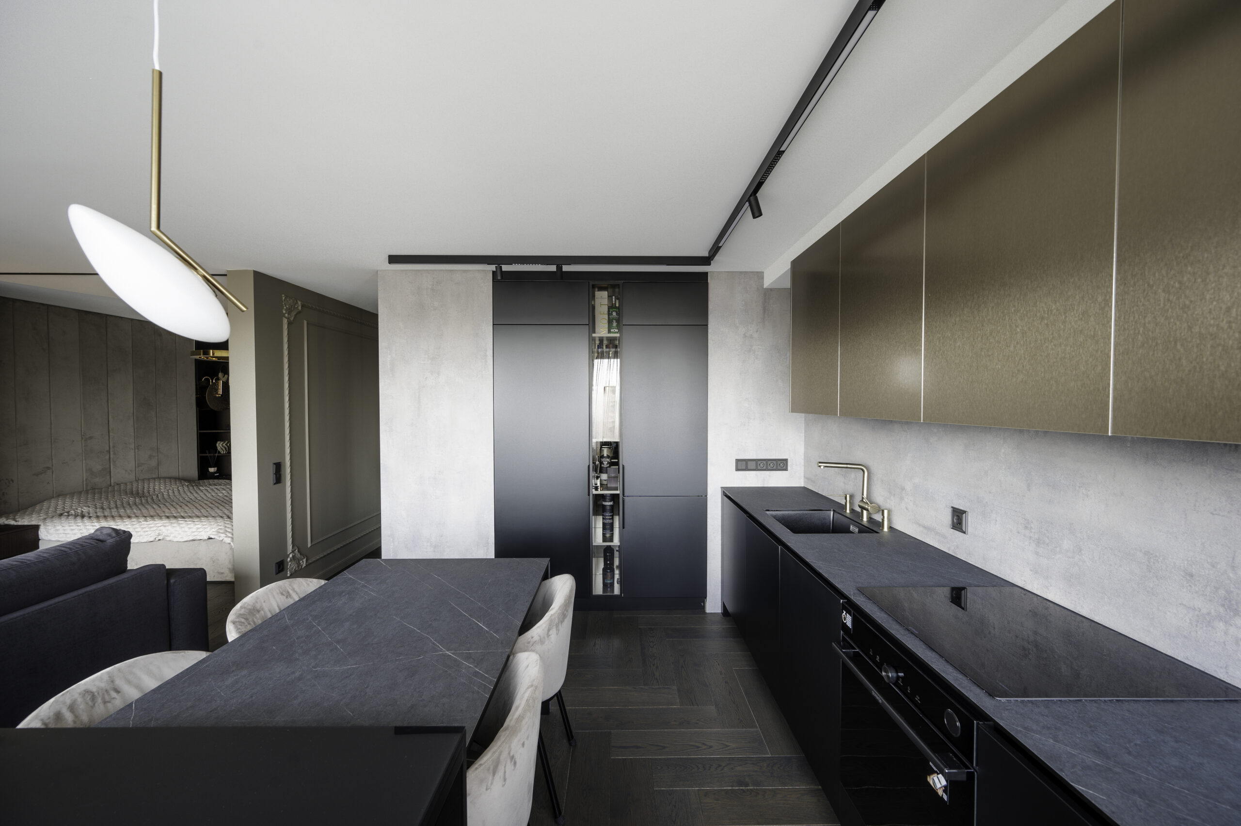Tai drąsus, modernus ir išraiškingas butas su nuostabia panorama į Vilnių. Kaip ir kiekvienas interjeras, tai ir šis yra Užsakovo atspindys. Užsakovas yra jaunas, nebijantis iššūkių vyras, todėl bute persipynė klasikos ir modernumo elementai. Nebijojome tamsių tonų, aukso akcentų ir sunkių drobinių užuolaidų, kurios atskyrė miegamąjį nuo svetainės, nes tai studijos tipo butas.