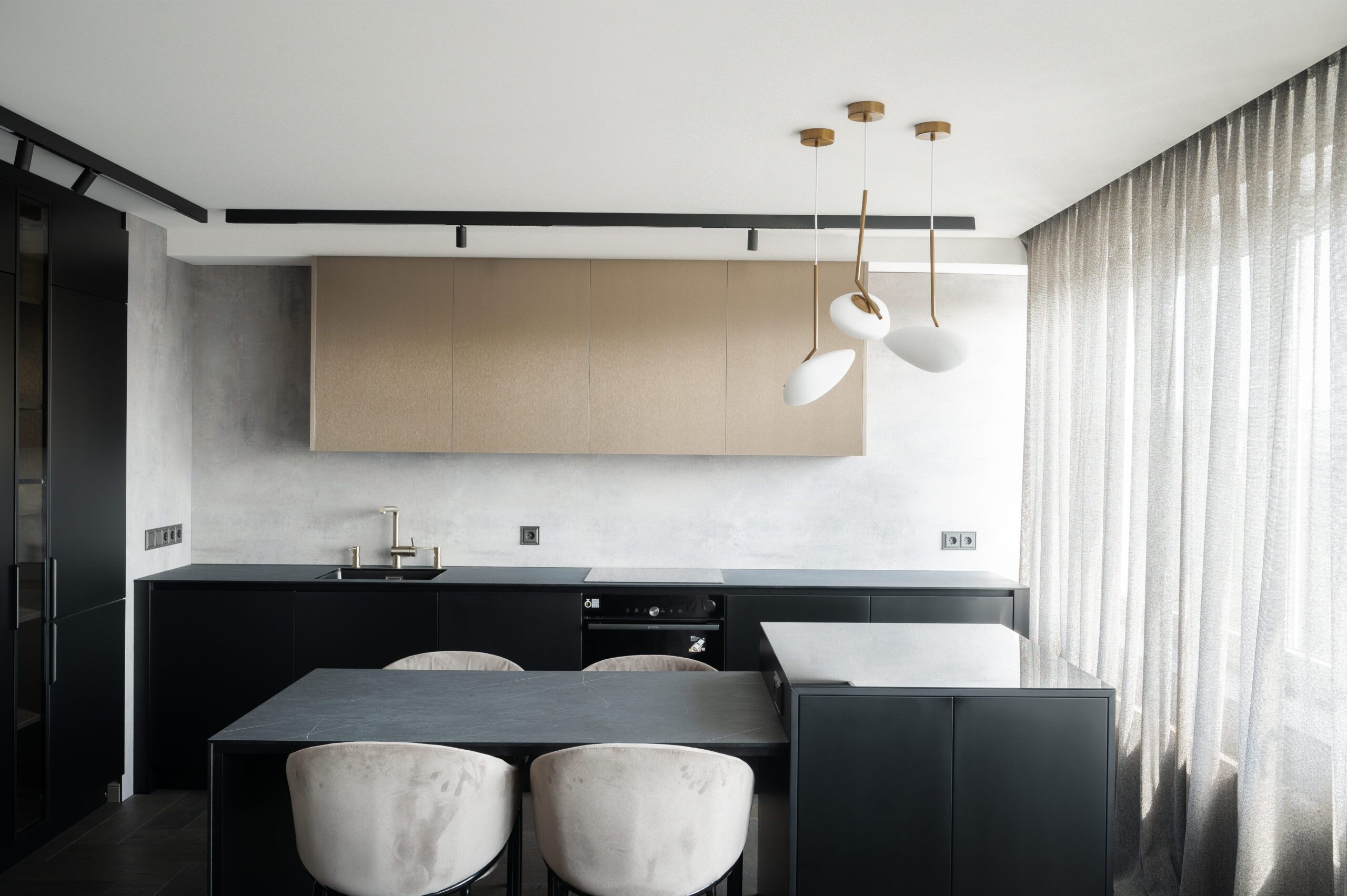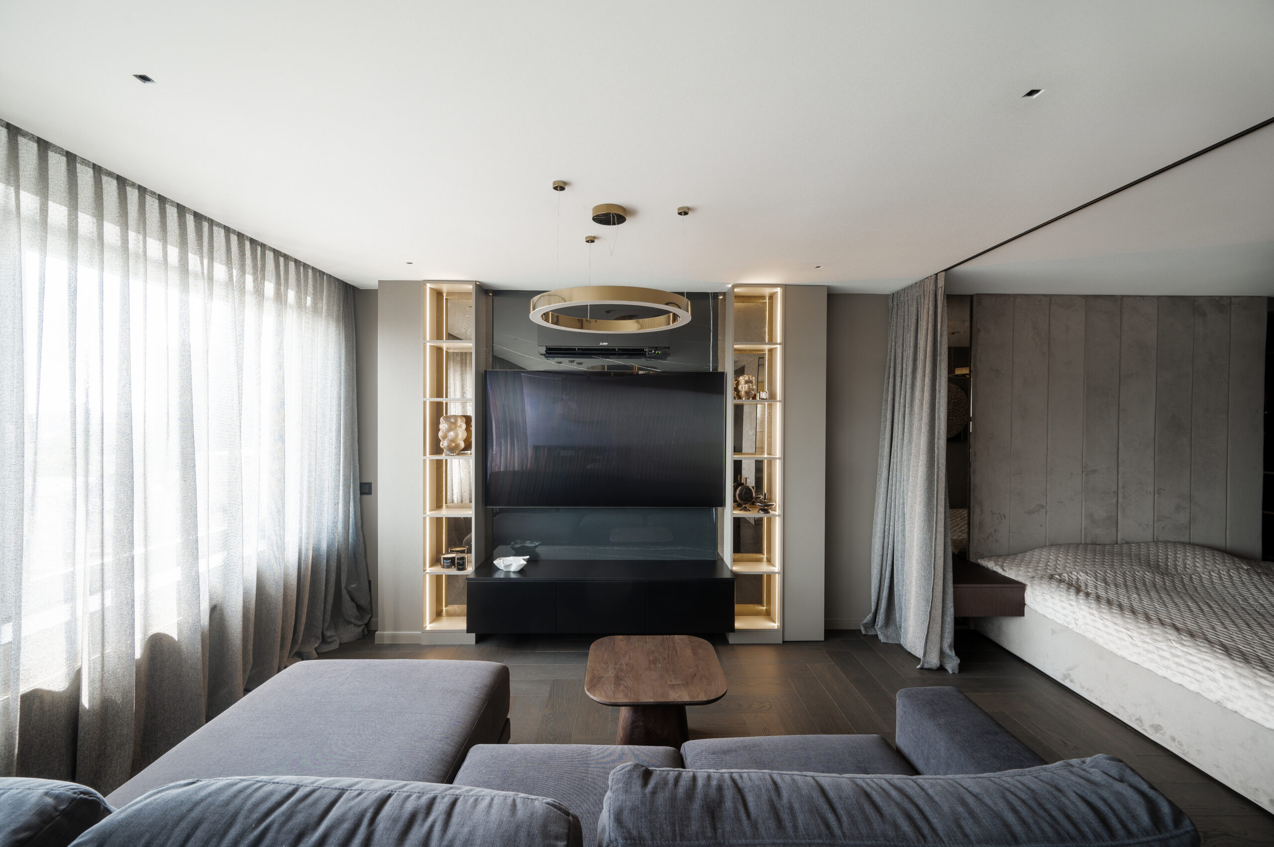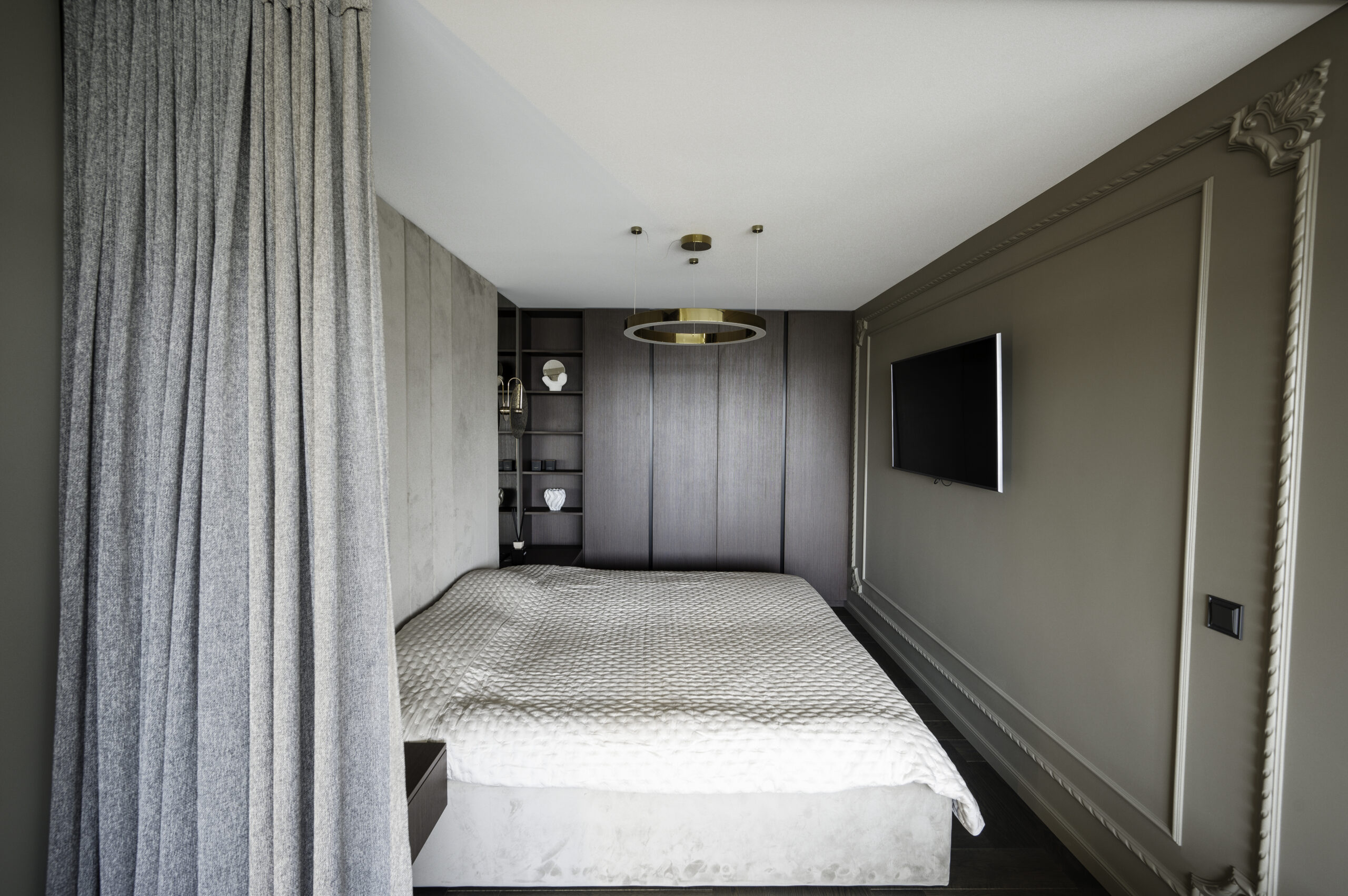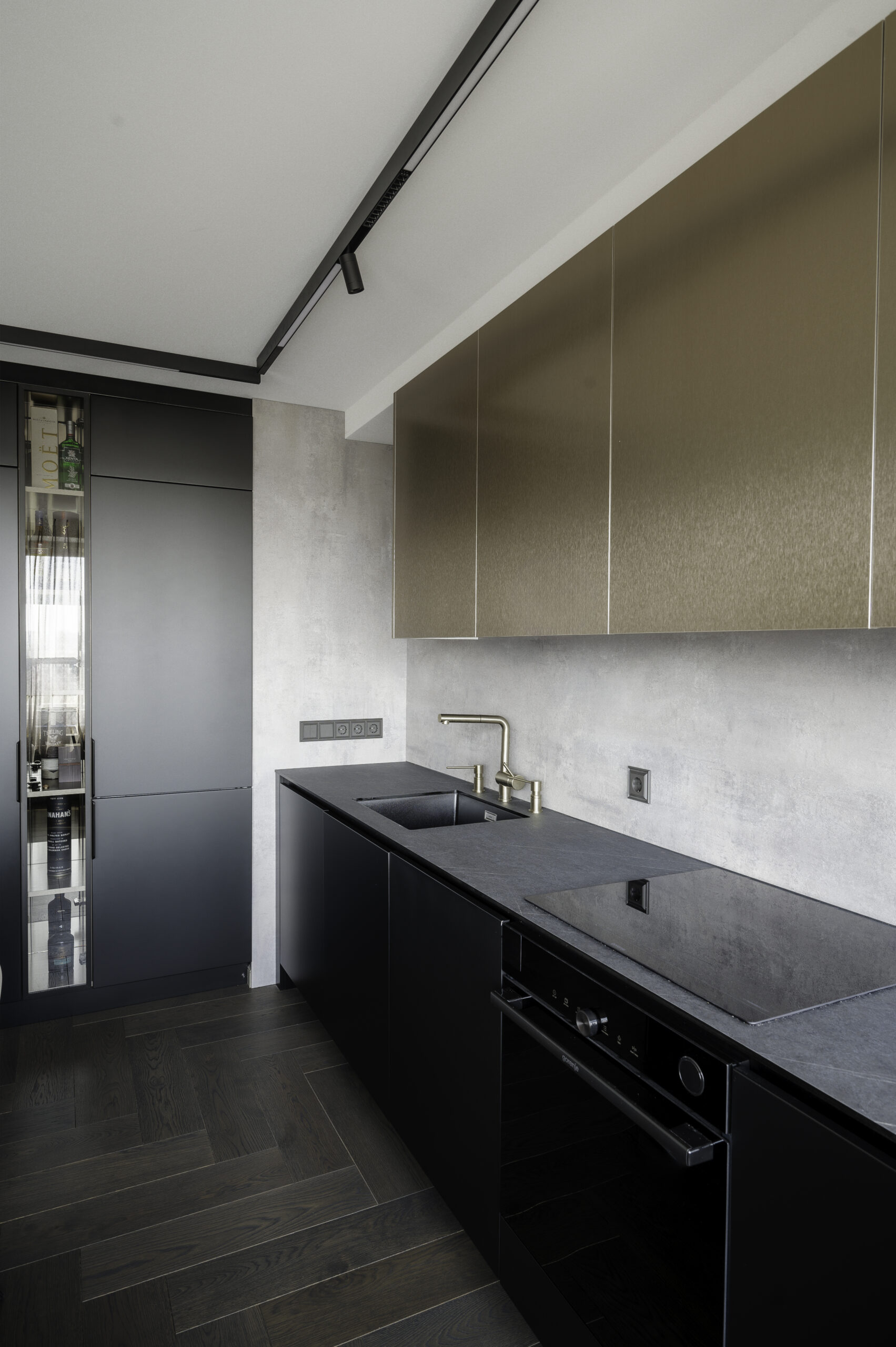 Tai drąsus, modernus ir išraiškingas butas su nuostabia panorama į Vilnių. Kaip ir kiekvienas interjeras, tai ir šis yra Užsakovo atspindys. Užsakovas yra jaunas, nebijantis iššūkių vyras, todėl bute persipynė klasikos ir modernumo elementai. Nebijojome tamsių tonų, aukso akcentų ir sunkių drobinių užuolaidų, kurios atskyrė miegamąjį nuo svetainės, nes tai studijos tipo butas.