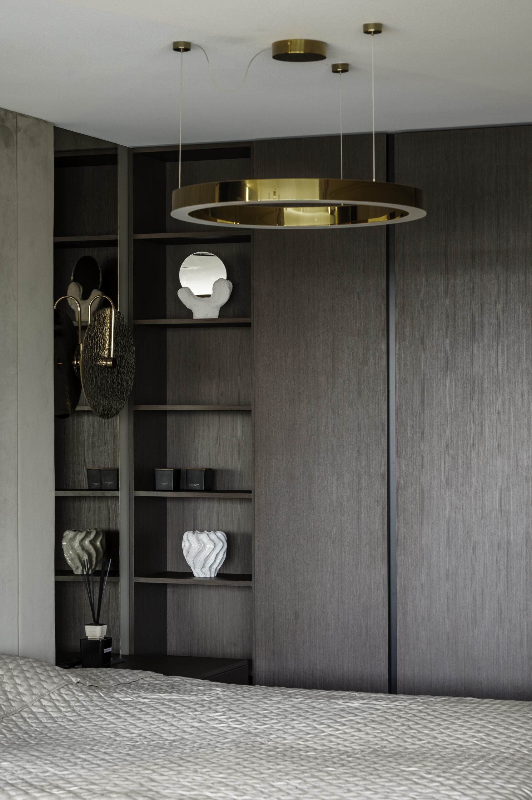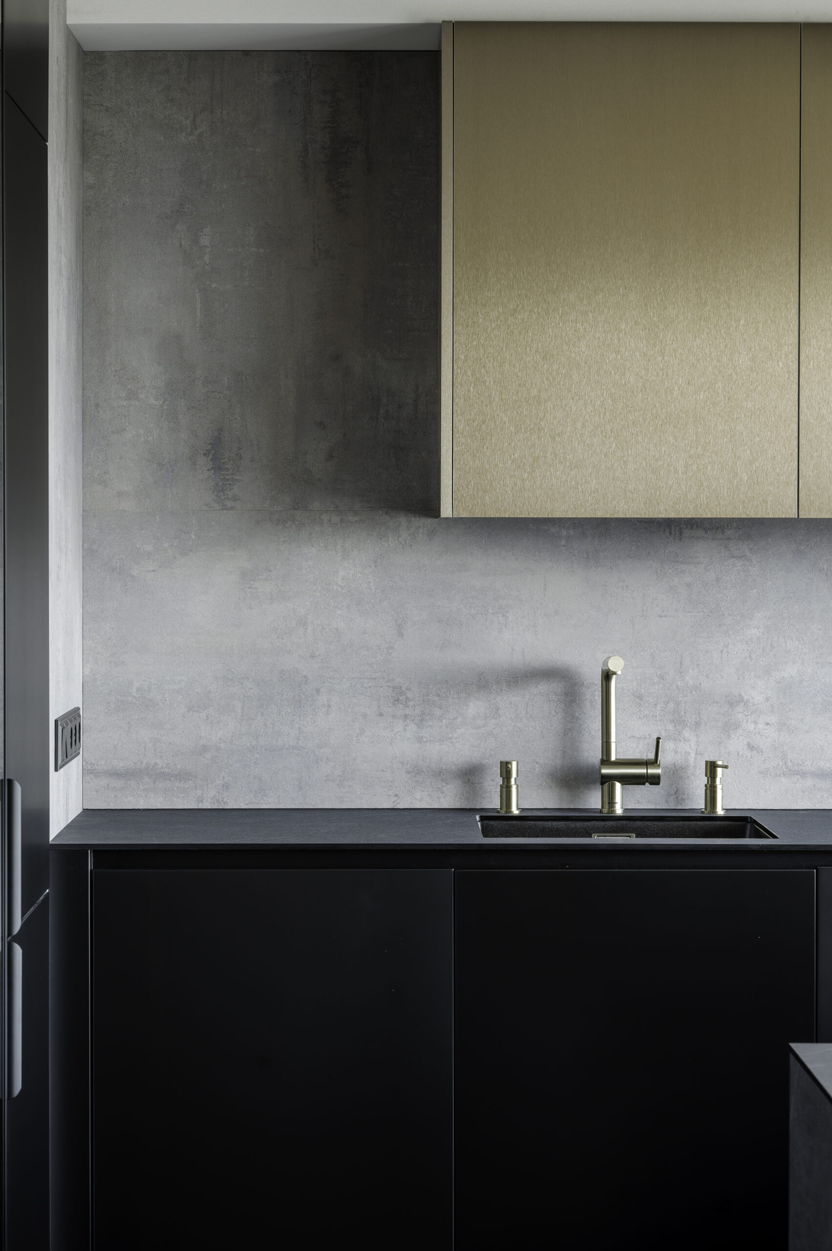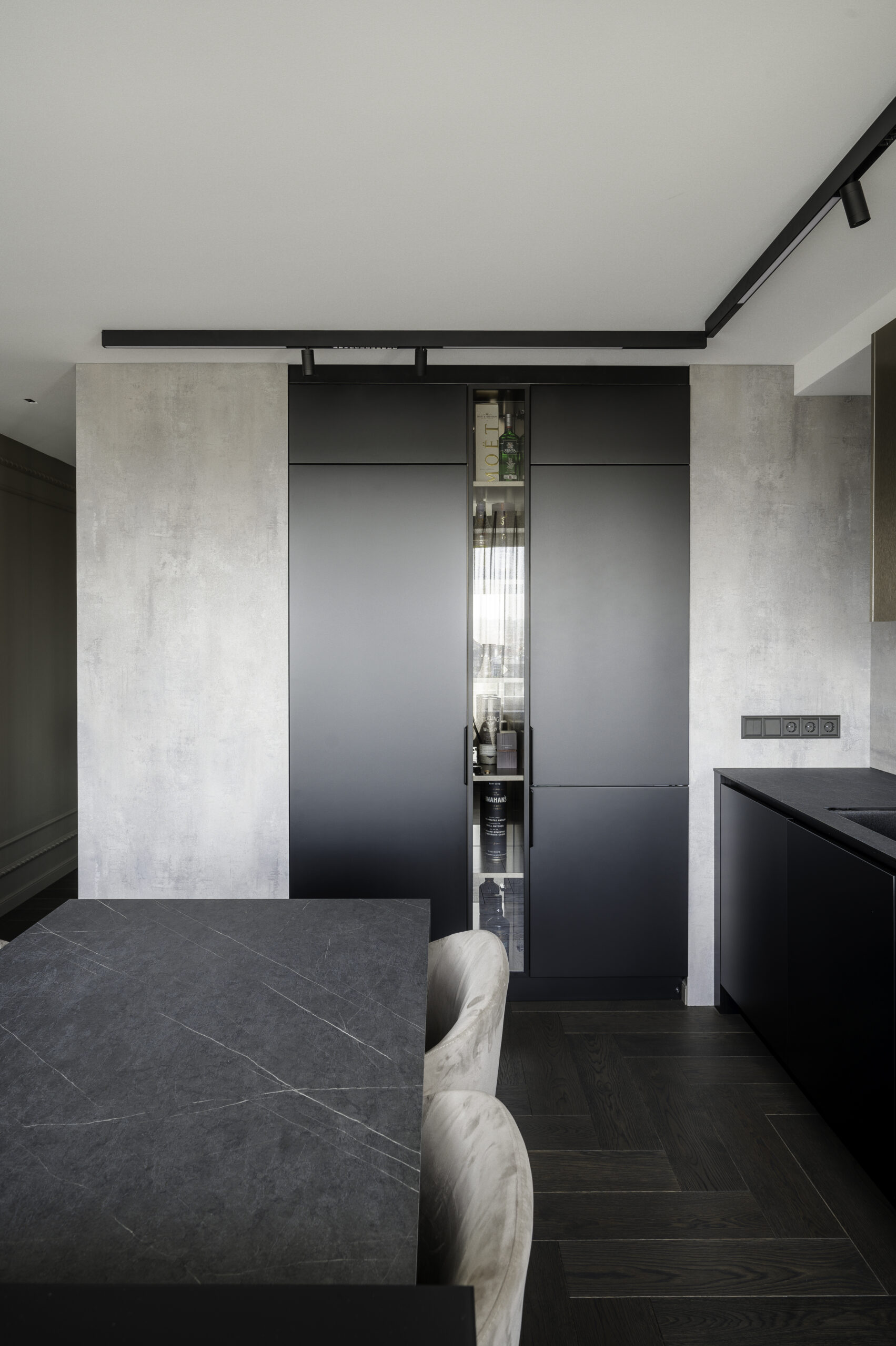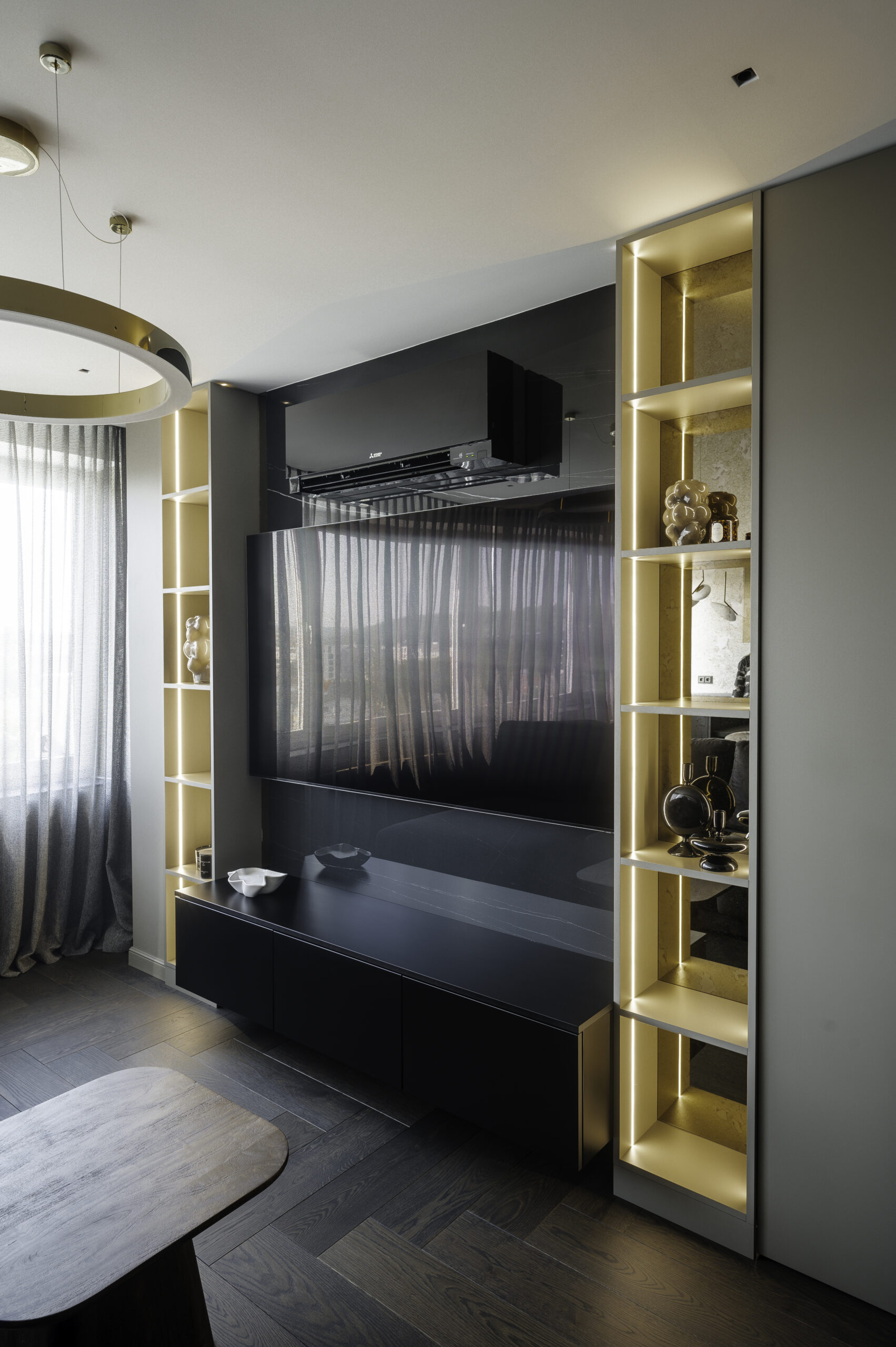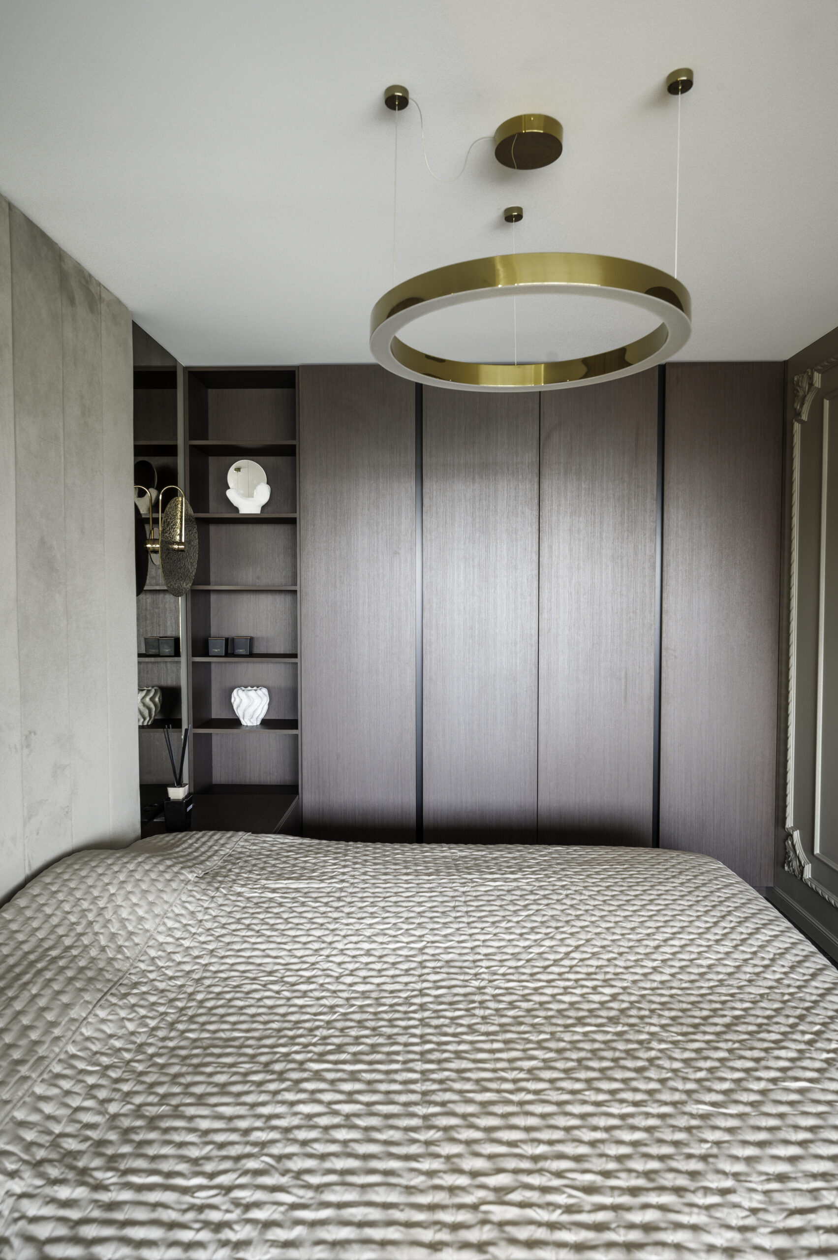 Tai drąsus, modernus ir išraiškingas butas su nuostabia panorama į Vilnių. Kaip ir kiekvienas interjeras, tai ir šis yra Užsakovo atspindys. Užsakovas yra jaunas, nebijantis iššūkių vyras, todėl bute persipynė klasikos ir modernumo elementai. Nebijojome tamsių tonų, aukso akcentų ir sunkių drobinių užuolaidų, kurios atskyrė miegamąjį nuo svetainės, nes tai studijos tipo butas.