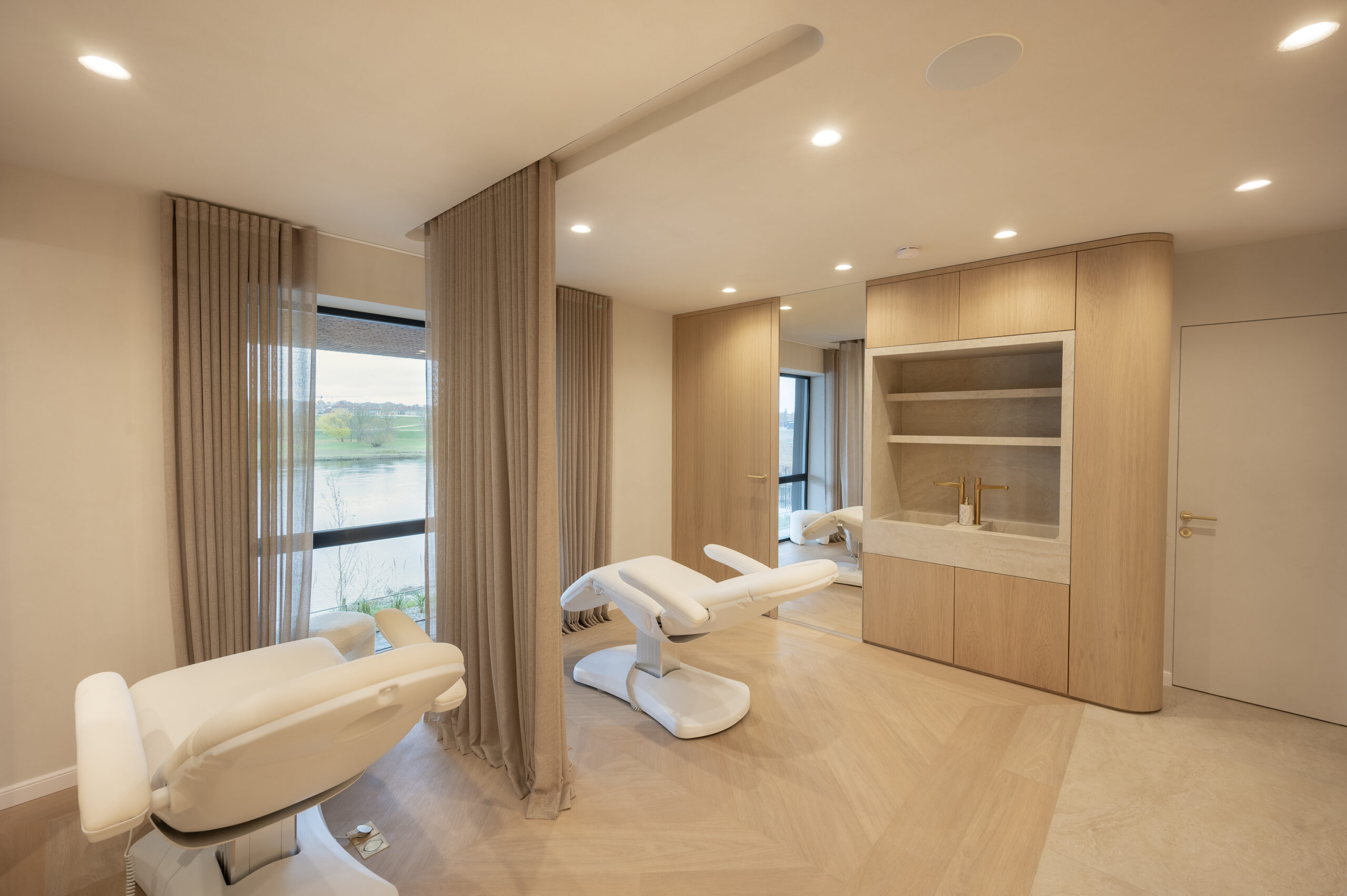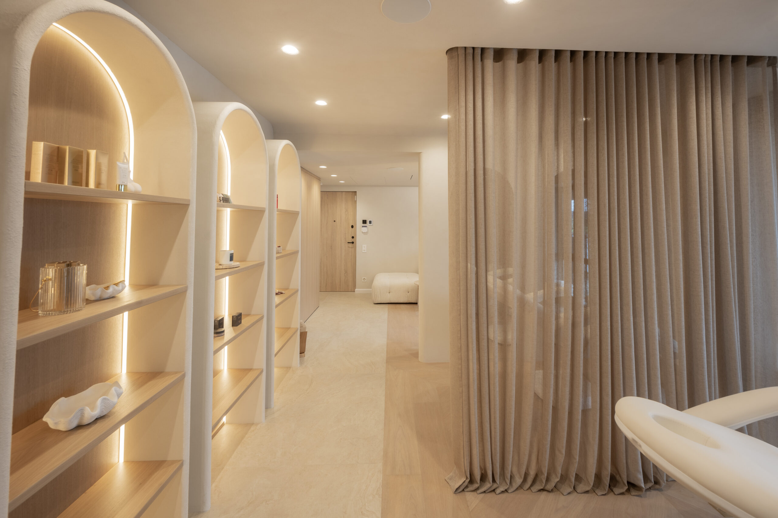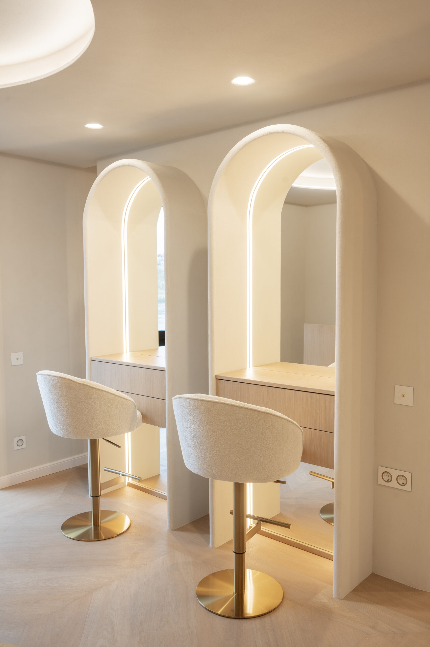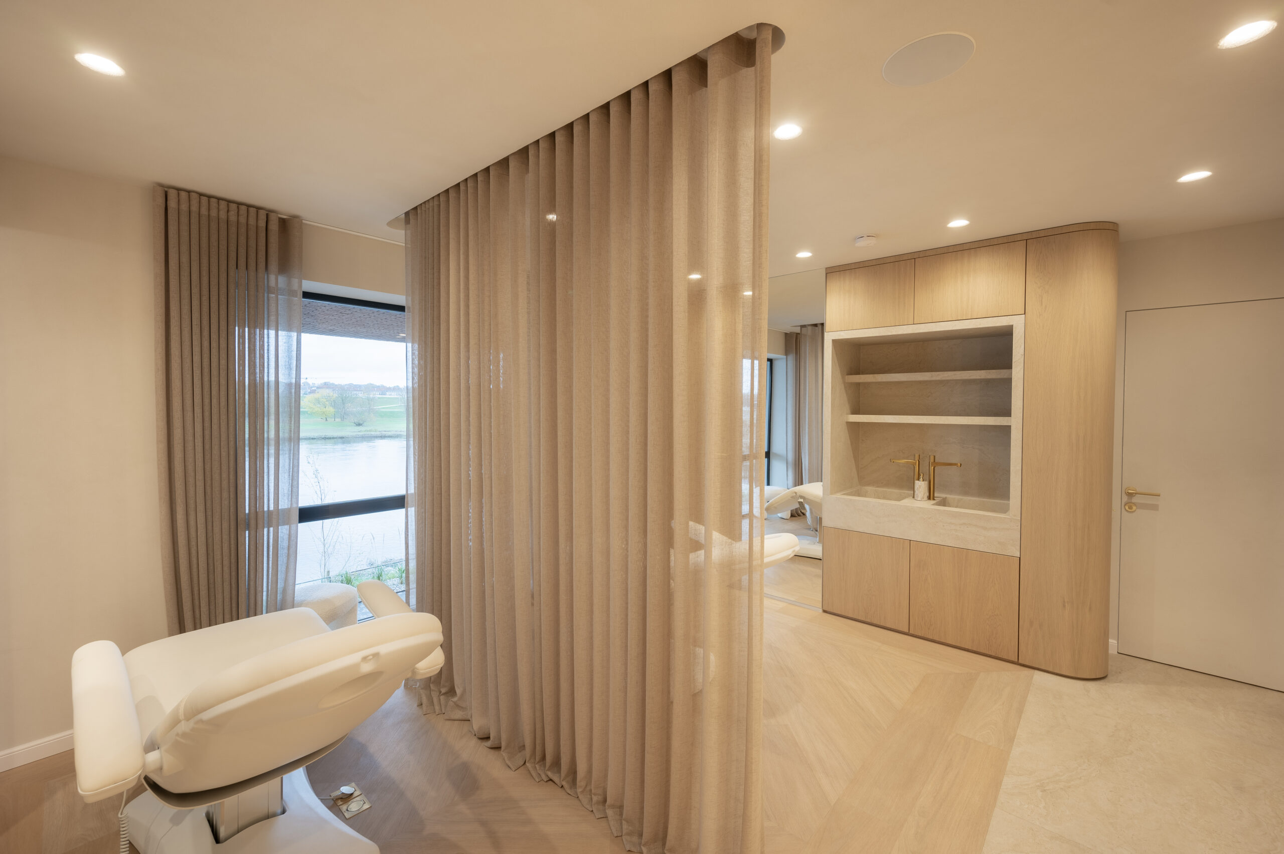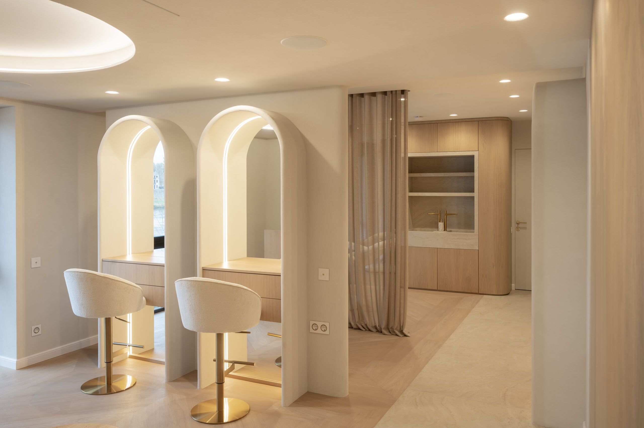 Interjero idėja gime tik įžėngus į patalpas ir pamačius vaizdą pro langus. Norėjosi jaukumo, naturalių medžagų, neapkrautos erdvės, užapvalintų formų. Todėl labai atsakingai parinkome medžiagas kurias integravome viso salono interjere. Sienų spalva ir jos dekoras perėjo ant lubų, užapvalintos baldų formos atsikartojo lubose ir nišose. Viskas apsijungė į vieną jaukią ir švelnią paletę.