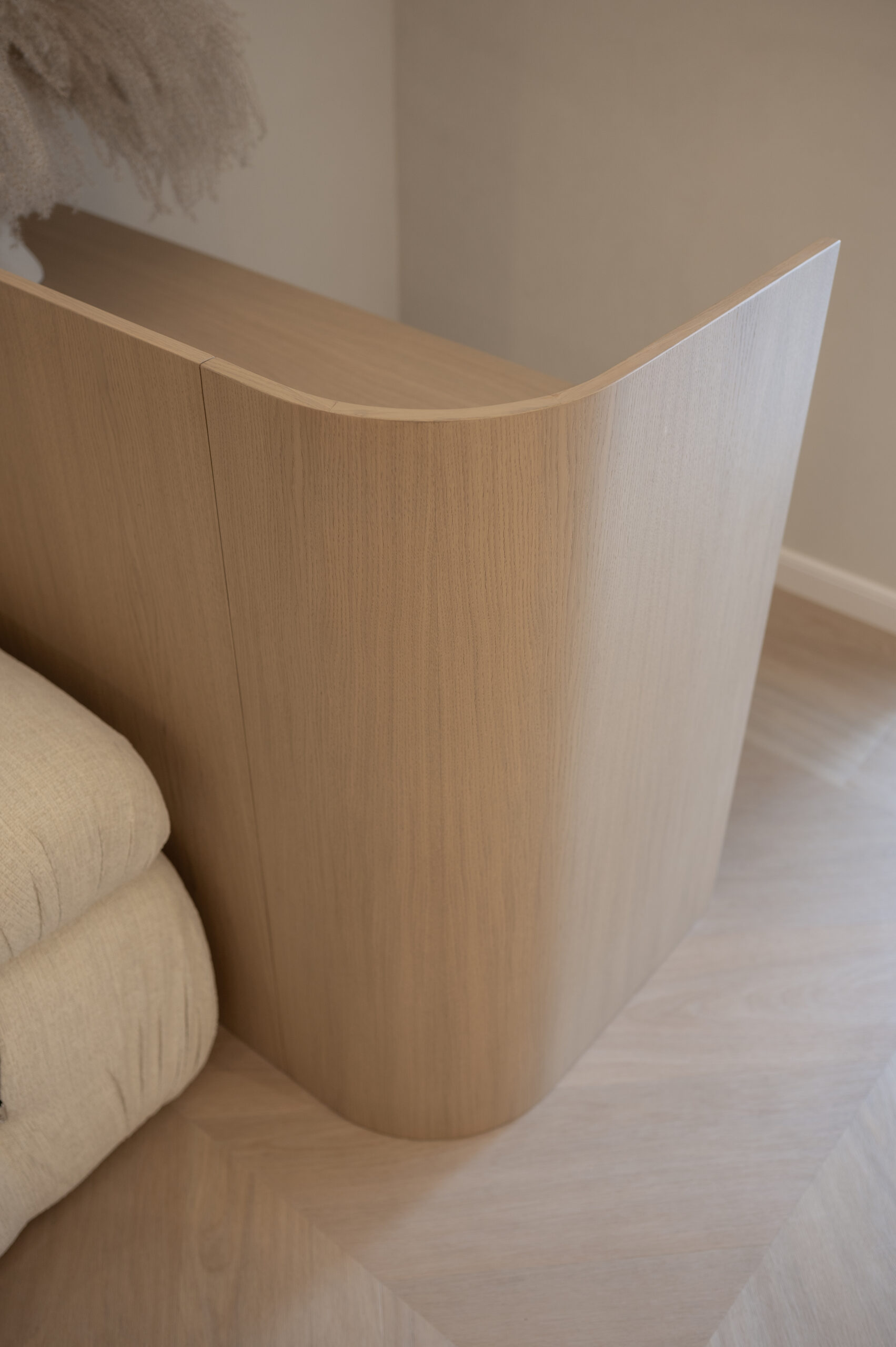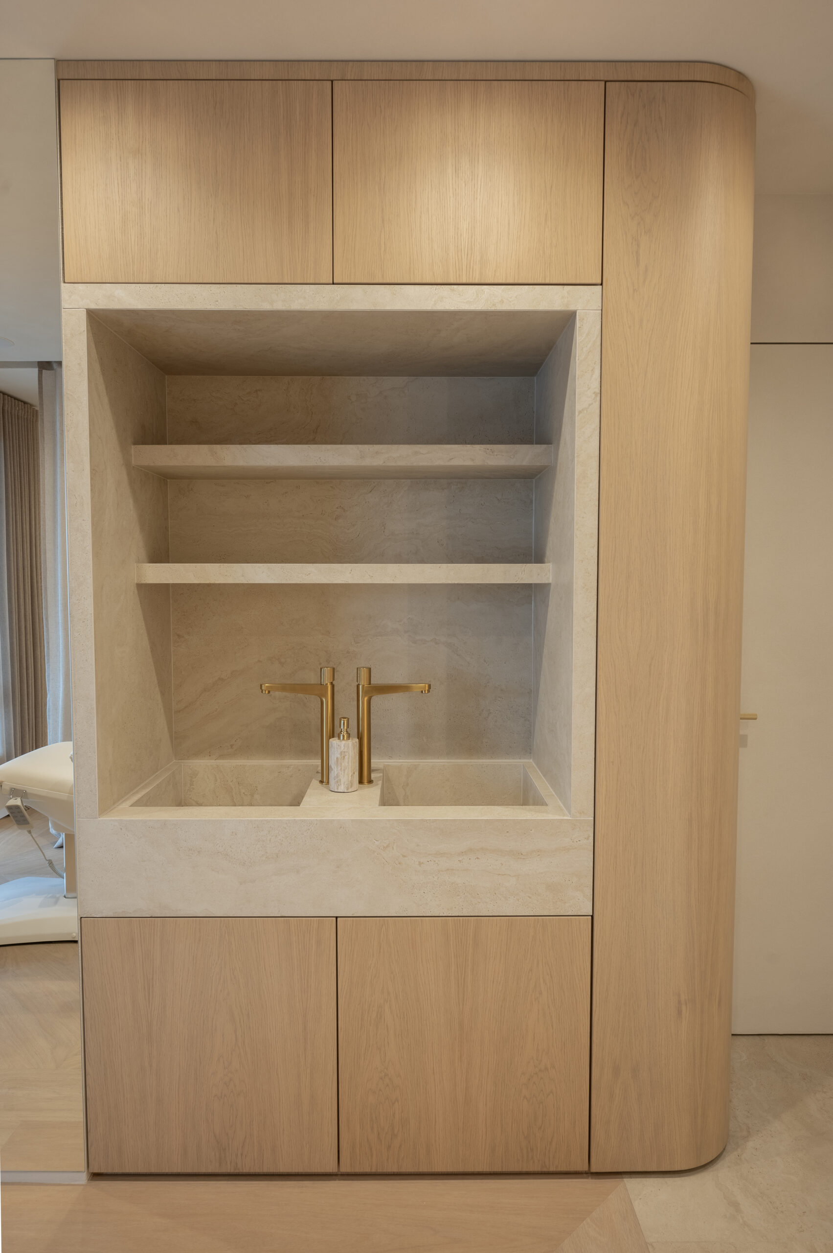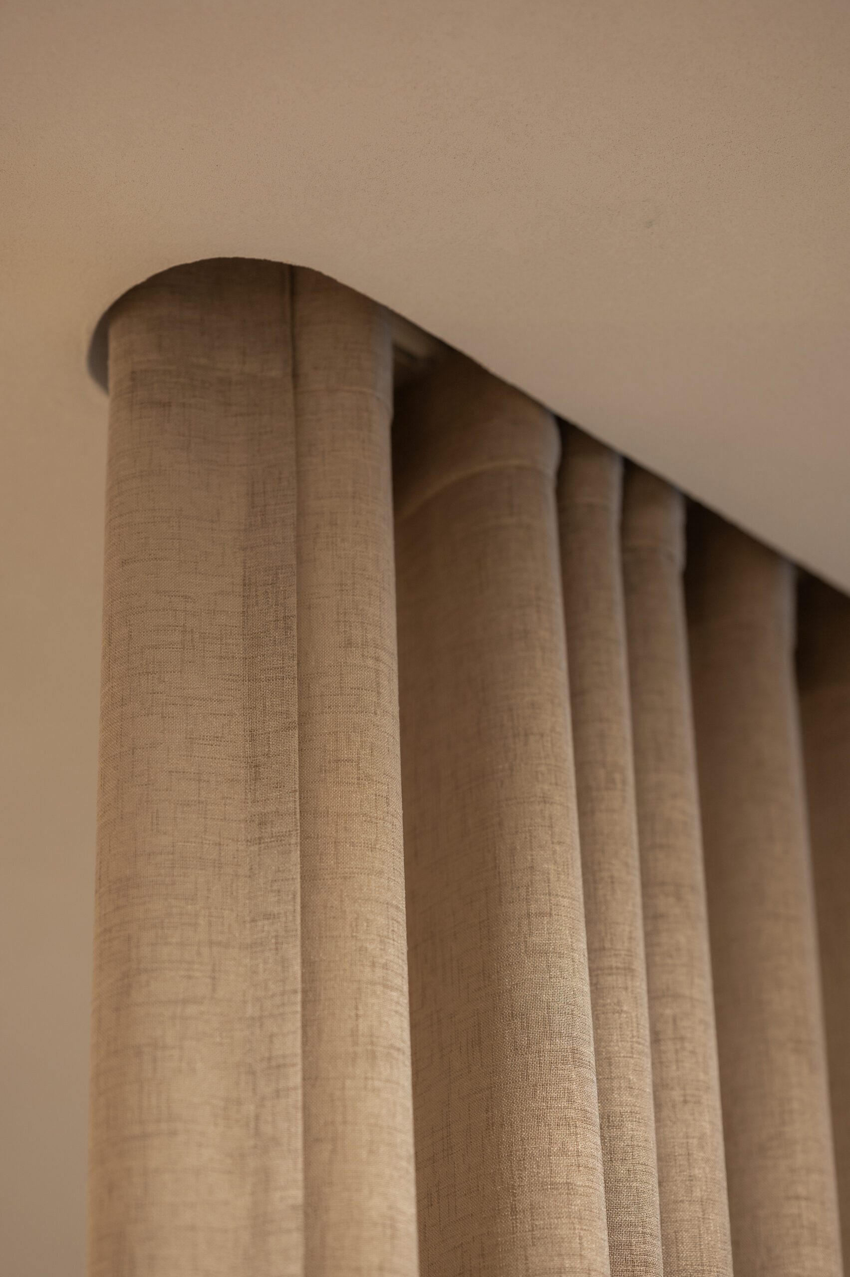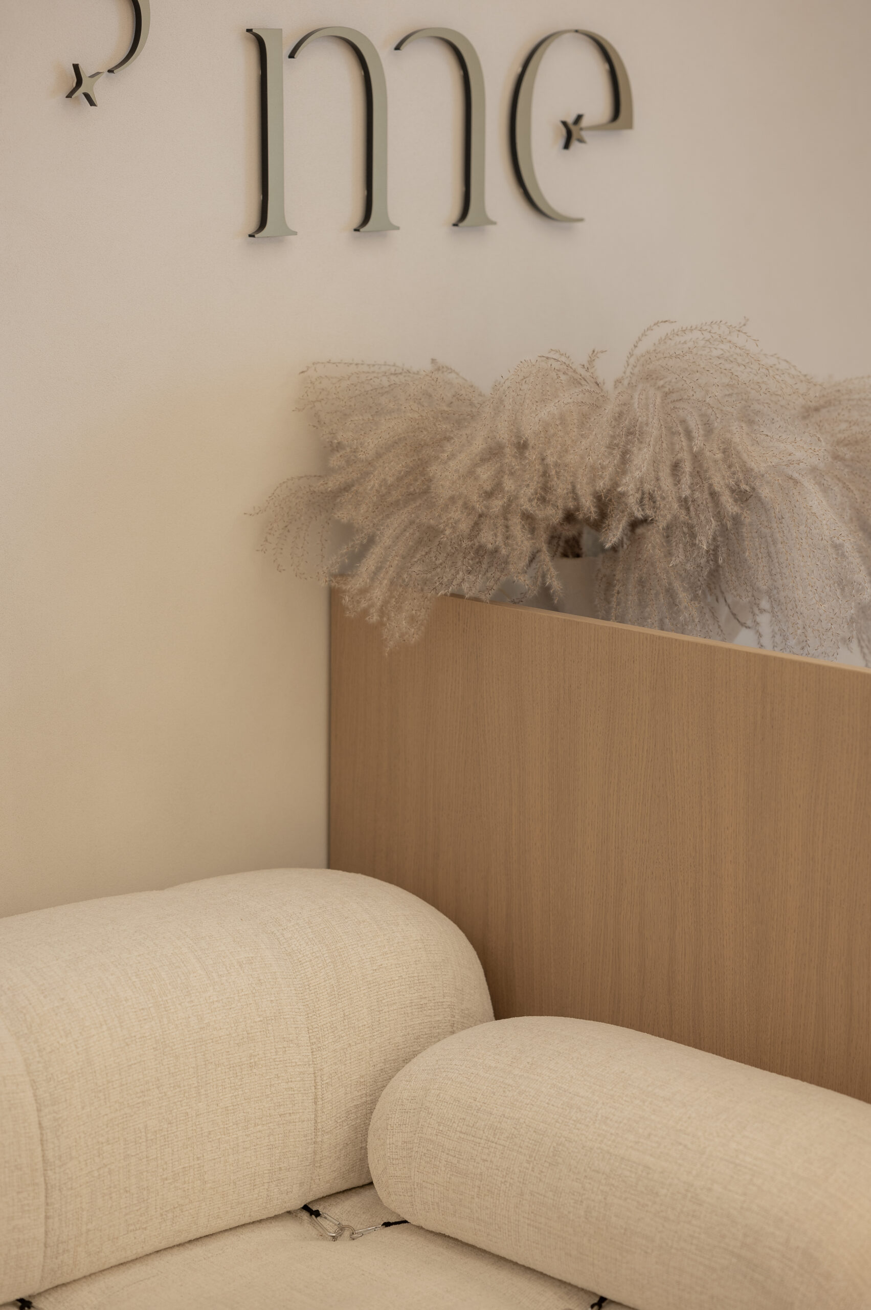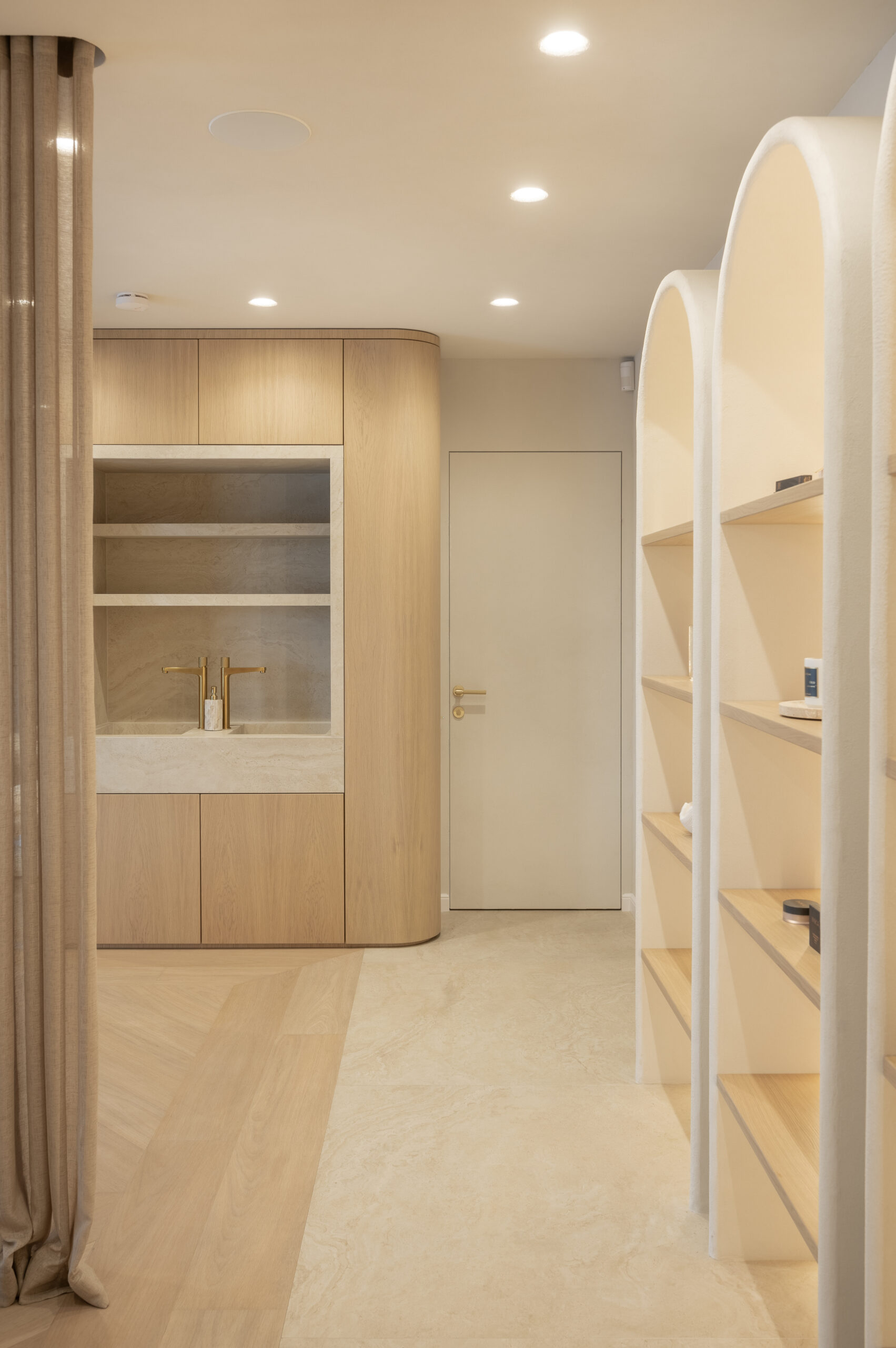 Interjero idėja gime tik įžėngus į patalpas ir pamačius vaizdą pro langus. Norėjosi jaukumo, naturalių medžagų, neapkrautos erdvės, užapvalintų formų. Todėl labai atsakingai parinkome medžiagas kurias integravome viso salono interjere. Sienų spalva ir jos dekoras perėjo ant lubų, užapvalintos baldų formos atsikartojo lubose ir nišose. Viskas apsijungė į vieną jaukią ir švelnią paletę.